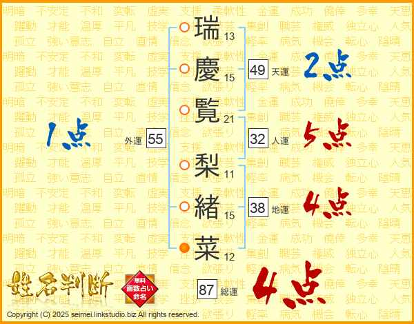 瑞慶覧梨緒菜さんの総運は87画の4点!