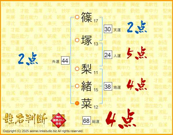 篠(17画)塚(13画) 梨(11画)緒(15画)菜(12画)