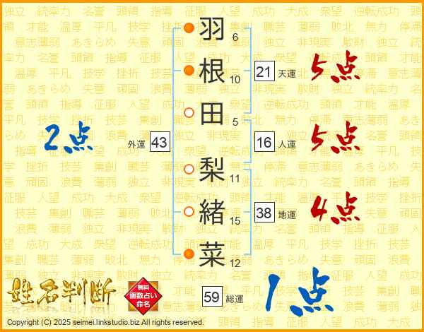 羽(6画)根(10画)田(5画) 梨(11画)緒(15画)菜(12画)
