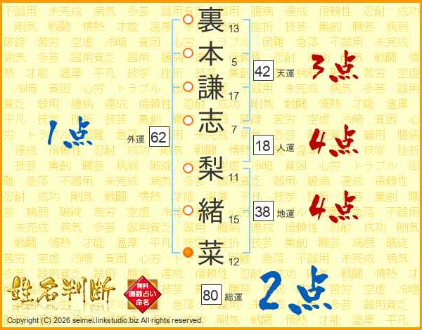 裏本謙志梨緒菜さんの人運は18画の4点!