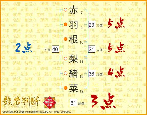 赤(7画)羽(6画)根(10画) 梨(11画)緒(15画)菜(12画)