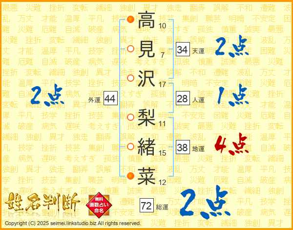 高(10画)見(7画)沢(17画) 梨(11画)緒(15画)菜(12画)