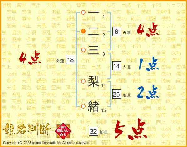 一(1画)二(2画)三(3画) 梨(11画)緒(15画)