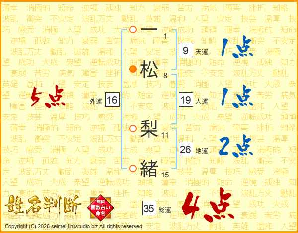 一(1画)松(8画) 梨(11画)緒(15画)