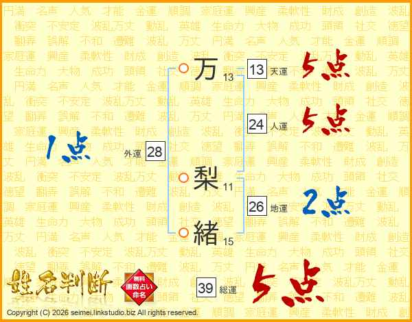 万(13画) 梨(11画)緒(15画)