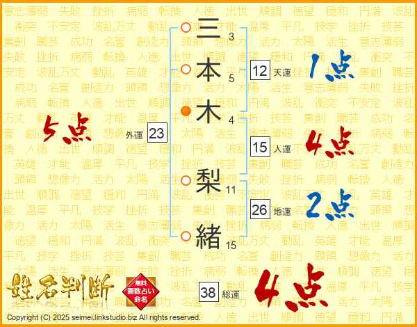 三(3画)本(5画)木(4画) 梨(11画)緒(15画)