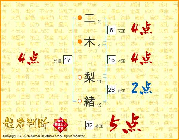 生活面を象徴する運勢です。外部から受ける影響力を表し、結婚運、家庭運や職場、環境への順応性を表します。総運から人運を引いた画数。姓や名が1文字の場合を除く。