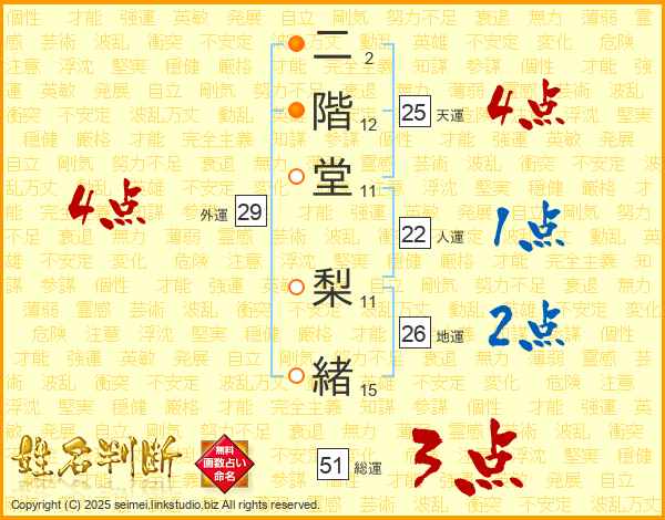 二(2画)階(12画)堂(11画) 梨(11画)緒(15画)