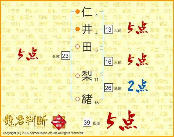 仁(4画)井(4画)田(5画) 梨(11画)緒(15画)