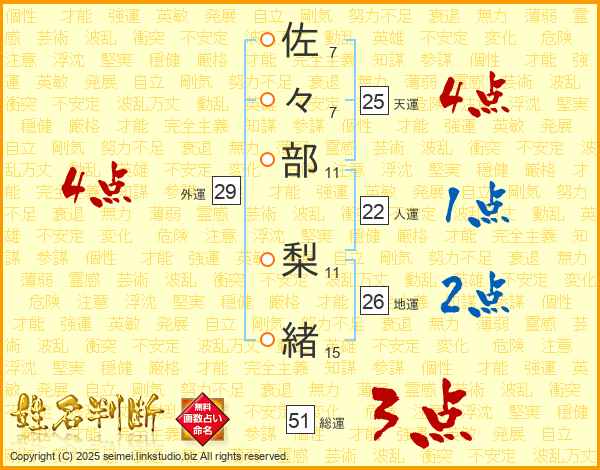 佐(7画)々(7画)部(11画) 梨(11画)緒(15画)