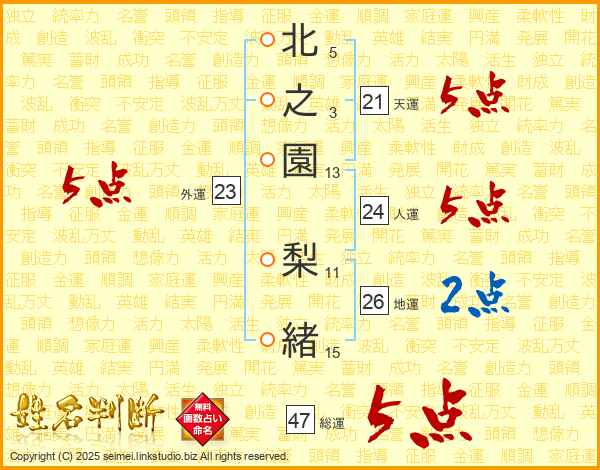 北(5画)之(3画)園(13画) 梨(11画)緒(15画)