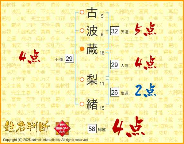 古(5画)波(9画)蔵(18画) 梨(11画)緒(15画)