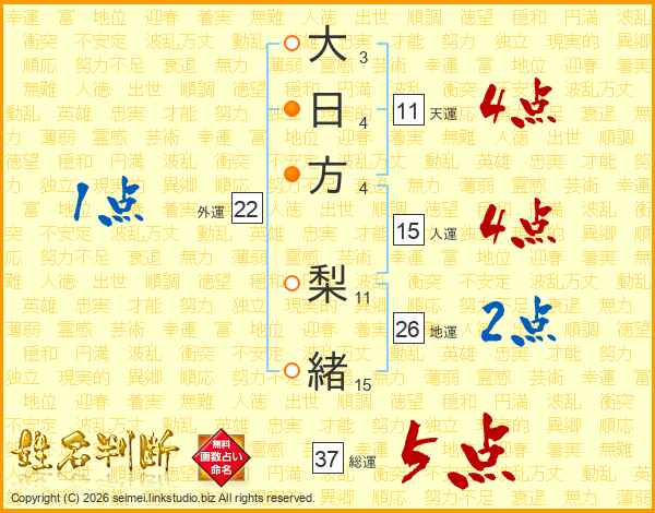 大(3画)日(4画)方(4画) 梨(11画)緒(15画)