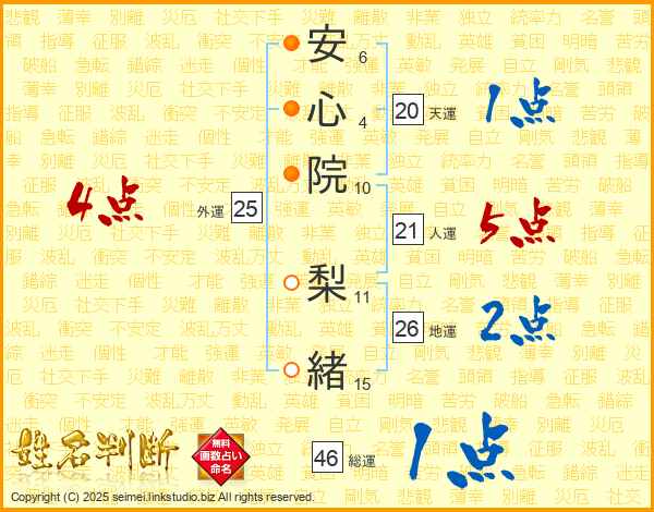 安(6画)心(4画)院(10画) 梨(11画)緒(15画)