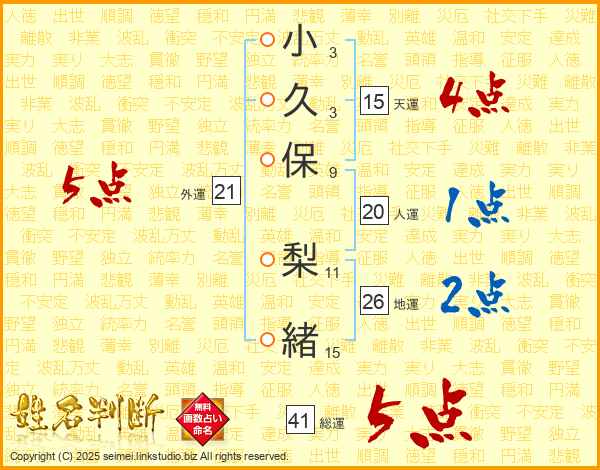 小(3画)久(3画)保(9画) 梨(11画)緒(15画)