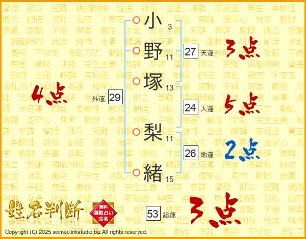 小(3画)野(11画)塚(13画) 梨(11画)緒(15画)
