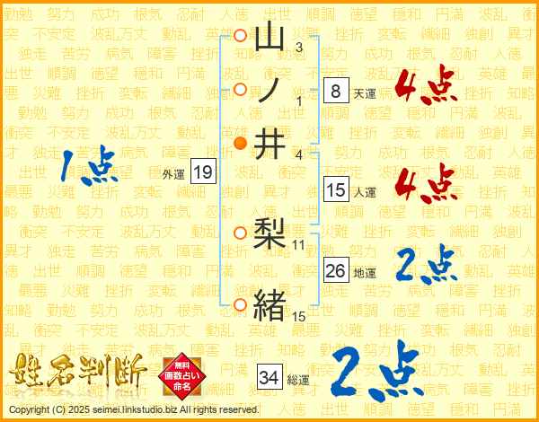 山(3画)ノ(1画)井(4画) 梨(11画)緒(15画)