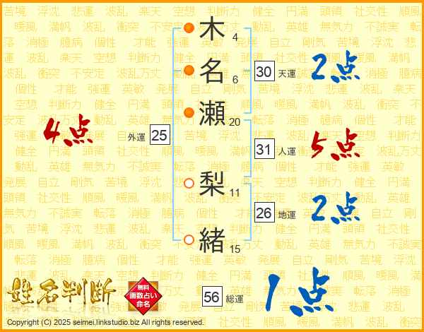 木(4画)名(6画)瀬(20画) 梨(11画)緒(15画)