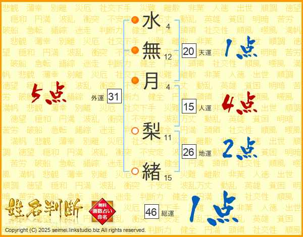 水(4画)無(12画)月(4画) 梨(11画)緒(15画)