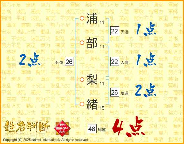 浦(11画)部(11画) 梨(11画)緒(15画)