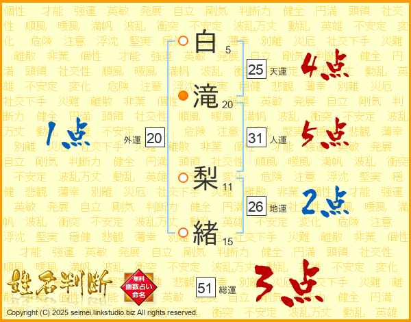 白(5画)滝(20画) 梨(11画)緒(15画)