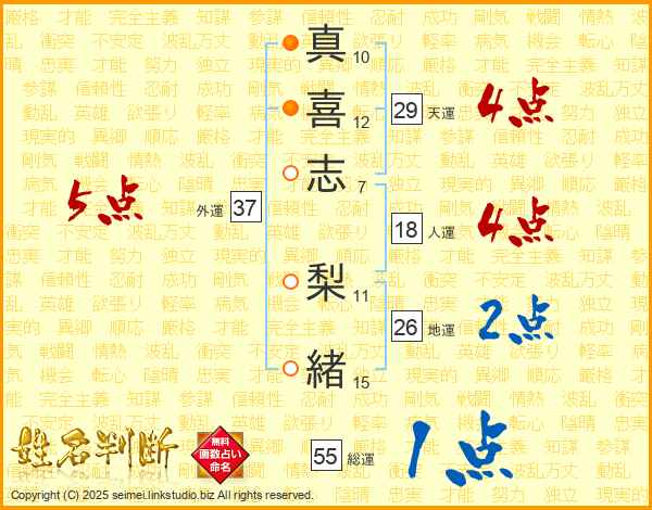 真(10画)喜(12画)志(7画) 梨(11画)緒(15画)