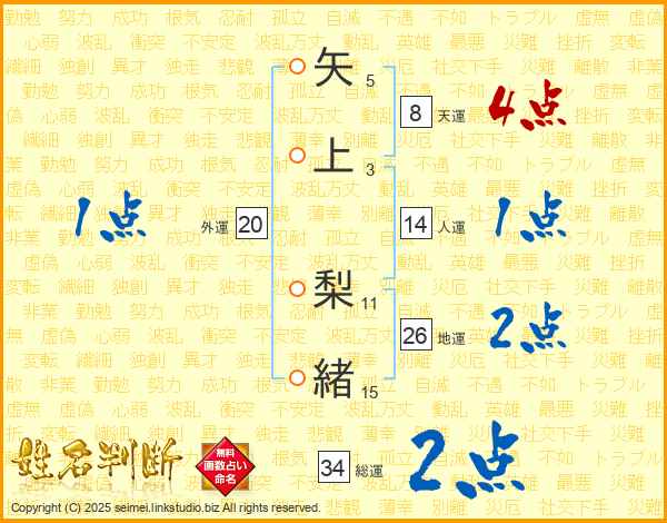 矢(5画)上(3画) 梨(11画)緒(15画)