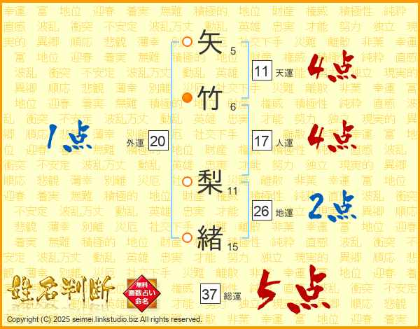 矢(5画)竹(6画) 梨(11画)緒(15画)
