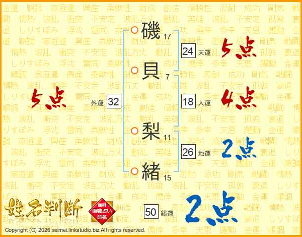 磯(17画)貝(7画) 梨(11画)緒(15画)