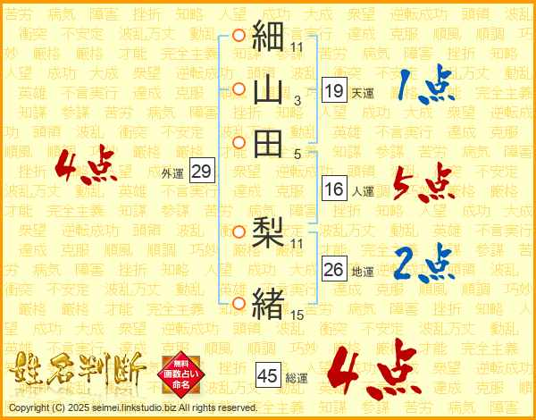 細(11画)山(3画)田(5画) 梨(11画)緒(15画)