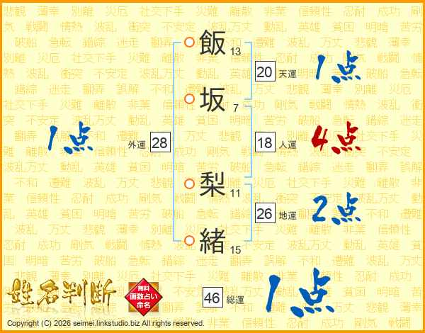 飯(13画)坂(7画) 梨(11画)緒(15画)