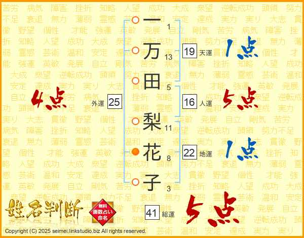 一(1画)万(13画)田(5画) 梨(11画)花(8画)子(3画)