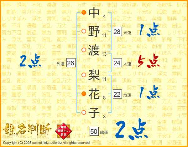 中(4画)野(11画)渡(13画) 梨(11画)花(8画)子(3画)