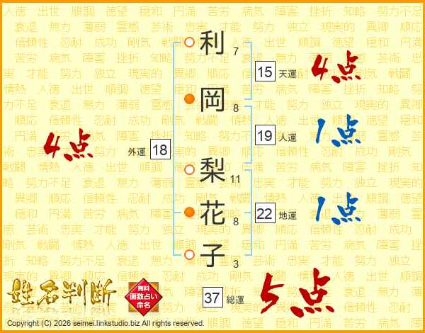 利(7画)岡(8画) 梨(11画)花(8画)子(3画)