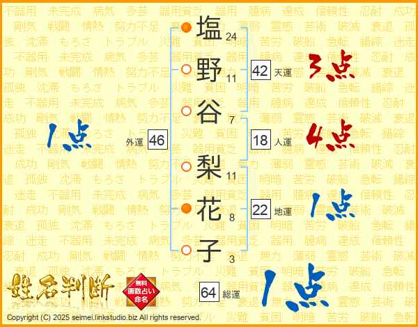 塩(24画)野(11画)谷(7画) 梨(11画)花(8画)子(3画)