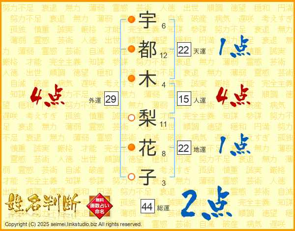 宇(6画)都(12画)木(4画) 梨(11画)花(8画)子(3画)