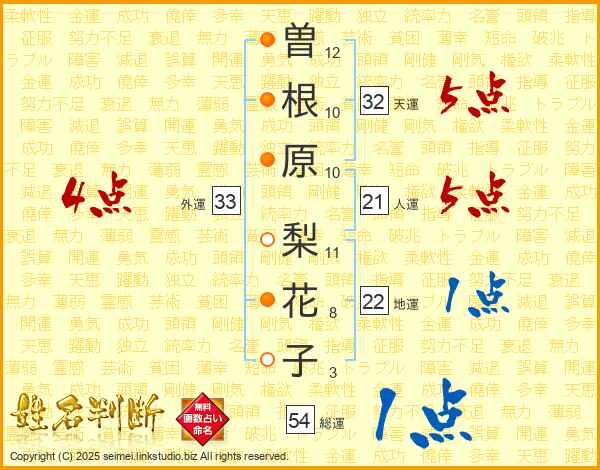 曽(12画)根(10画)原(10画) 梨(11画)花(8画)子(3画)