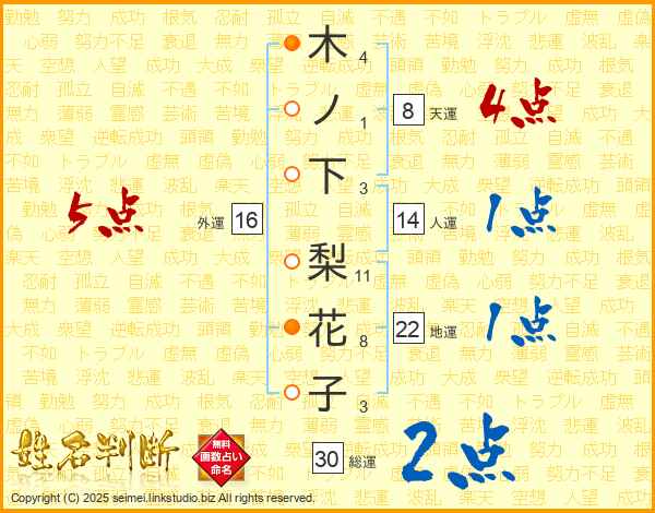 木ノ下梨花子さんの総運は30画の2点!