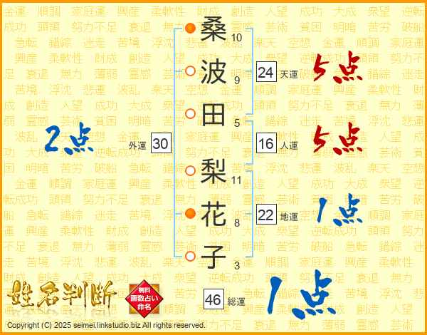 桑(10画)波(9画)田(5画) 梨(11画)花(8画)子(3画)