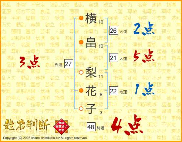 横(16画)畠(10画) 梨(11画)花(8画)子(3画)