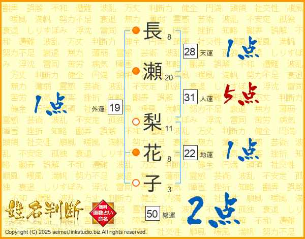 長(8画)瀬(20画) 梨(11画)花(8画)子(3画)