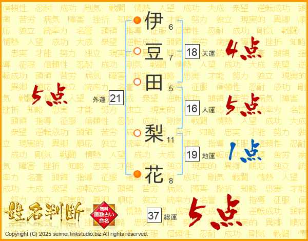 伊(6画)豆(7画)田(5画) 梨(11画)花(8画)