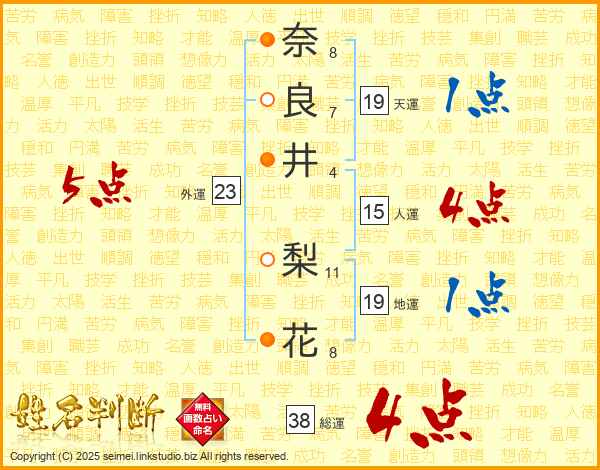 奈(8画)良(7画)井(4画) 梨(11画)花(8画)