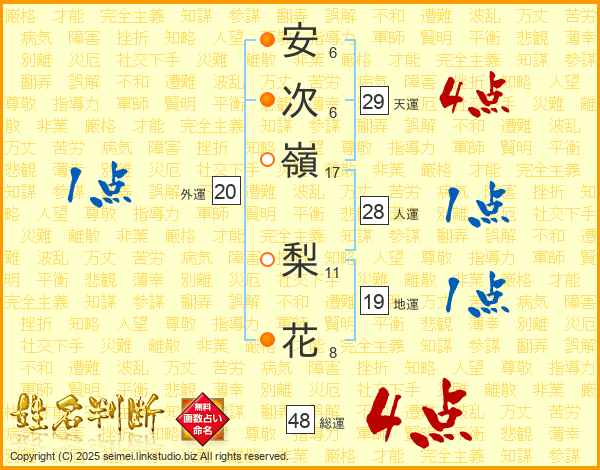 安(6画)次(6画)嶺(17画) 梨(11画)花(8画)