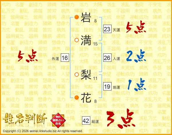 岩(8画)満(15画) 梨(11画)花(8画)