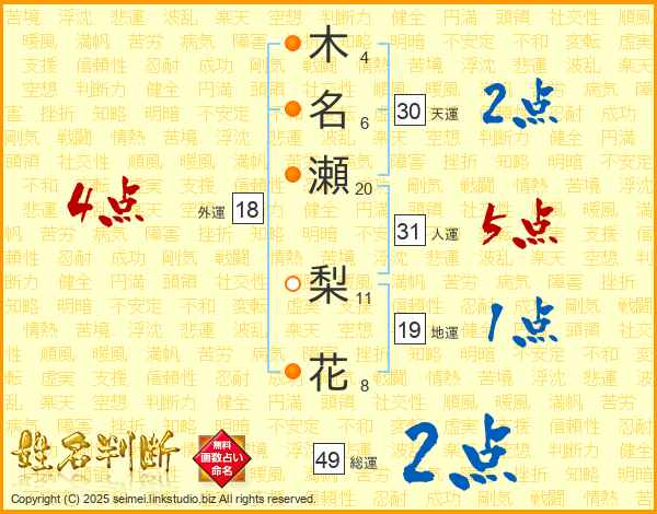 木(4画)名(6画)瀬(20画) 梨(11画)花(8画)