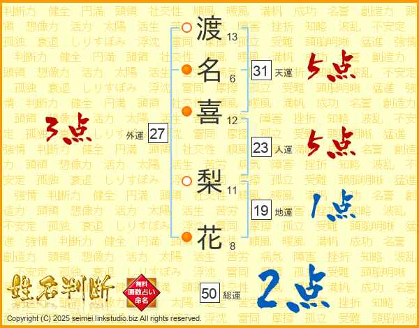 渡(13画)名(6画)喜(12画) 梨(11画)花(8画)