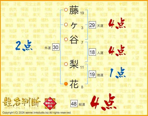 藤(19画)ヶ(3画)谷(7画) 梨(11画)花(8画)