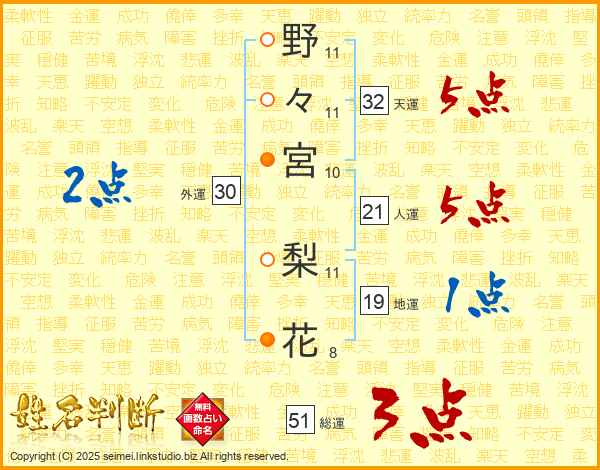 野(11画)々(11画)宮(10画) 梨(11画)花(8画)