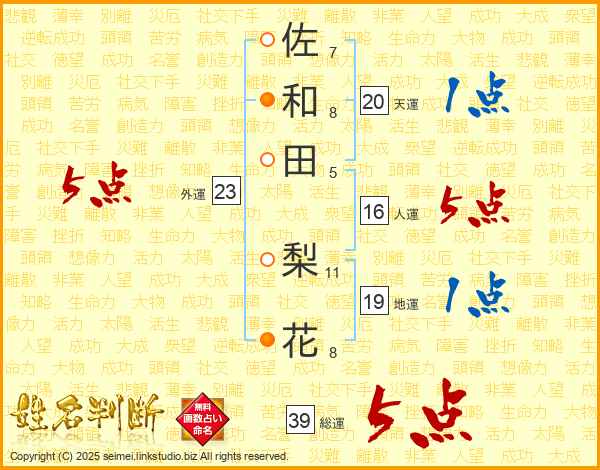 佐(7画)和(8画)田(5画) 梨(11画)花(8画)